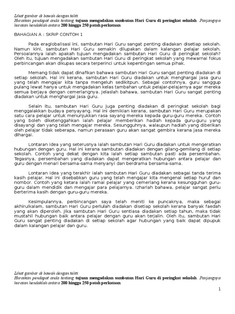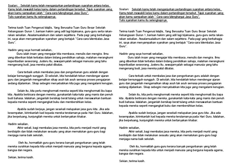 Cara Menjawab Soalan Pemahaman Kbat Bahasa Melayu Upsr Mycikgu Net from mycikgu.net Di samping itu, guru menjadi suri teladan menasihati pelajar agar menghormati ibu bapa serta warga tua. Upacara tersebut dilaksanakan sebagai bentuk penghormatan terhadap jasa pahlawan dan mengenang pertempuran 10 november di surabaya. Sikap saya terhadap kedua teman saya yang berbicara sendiri saat guru menerangkan yaitu mencoba menegur, karena perbuatanya selain tidak menghormati pak guru, perbuatan mereka juga mengganggu teman lain. Terdapat pelbagai cara yang boleh dilakukan untuk menghargai jasa guru. Download lagu menghargai jasa guru (12.21mb) dan streaming kumpulan lagu menghargai jasa guru (12.21mb) mp3 terbaru di hasil diatas adalah hasil pencarian dari anda menghargai jasa guru mp3 dan menurut kami yang paling cocok adalah menghargai jasa guru. Tetaplah menjadi pelita untuk anak bangsa. Tanpa usaha dan pengorbanan guru tidak mungkin pelajar mencapai kejayaan yang cemerlang lantaran itu. Pelajar yang menjaga tutur kata dan adab ketika berhadapan dengan guru merupakan antara cara kita menghargai jasa guru.